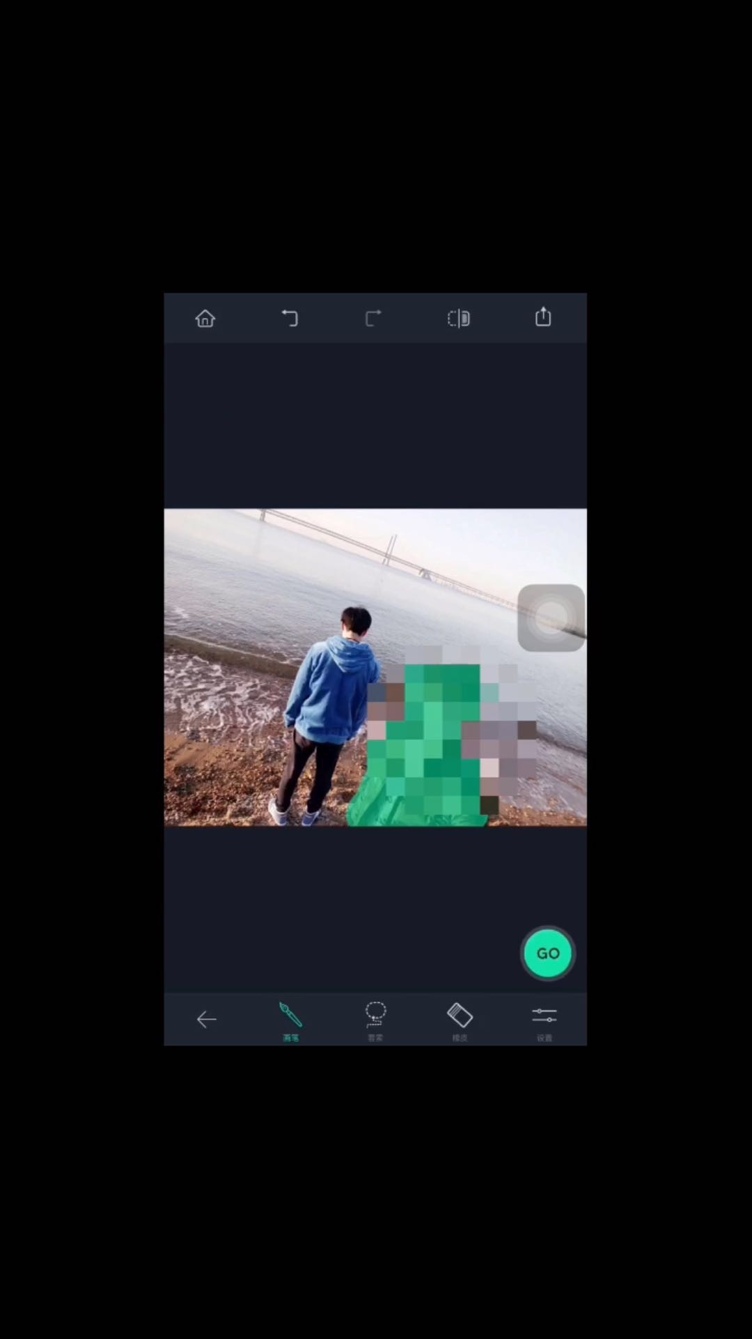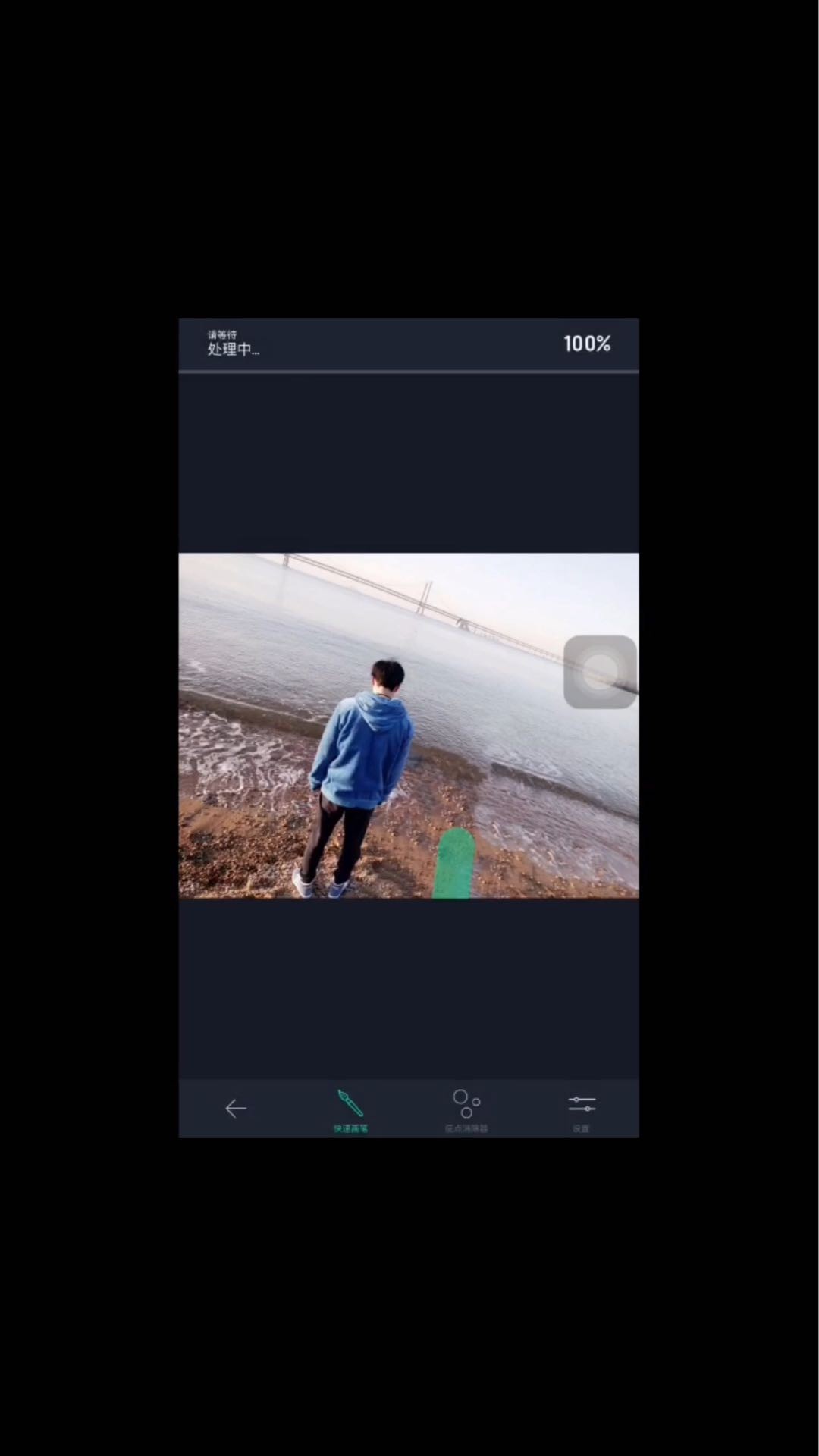 用泼辣修图软件打开刚才的图片,然后在最底下找到“点去除”。用“愈合”和“克隆”两种模式将地面的海水延长,修复一下抠图时留下的一些坑。差不多就算完成,之后有些瑕疵可以使用Retouch来修复。再配上滤镜,大概就看不出来了。