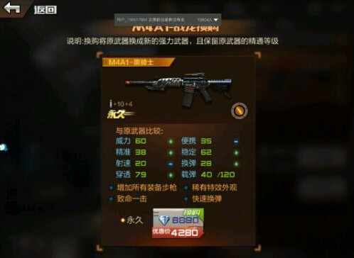 作为英雄武器,M4黑骑士换购是要花很多钱的,可能比单纯购买一把英雄武器还要贵,不过优点也很明显,那就是不要求VIP等级,平民玩家每天攒钻即可购买,非常划算。