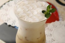 1、将一半的冰牛奶和香菜果露混合倒入钢杯中,打发起奶泡;