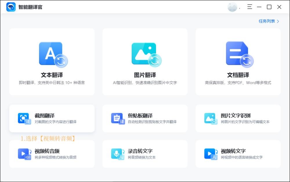 步骤一:在电脑上打开智能翻译官,在功能选择页选择【视频转音频】。