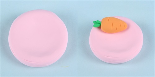 用粉红色粘土做成圆饼形作为小床,然后做一个胡萝卜造型的枕头放在上面。