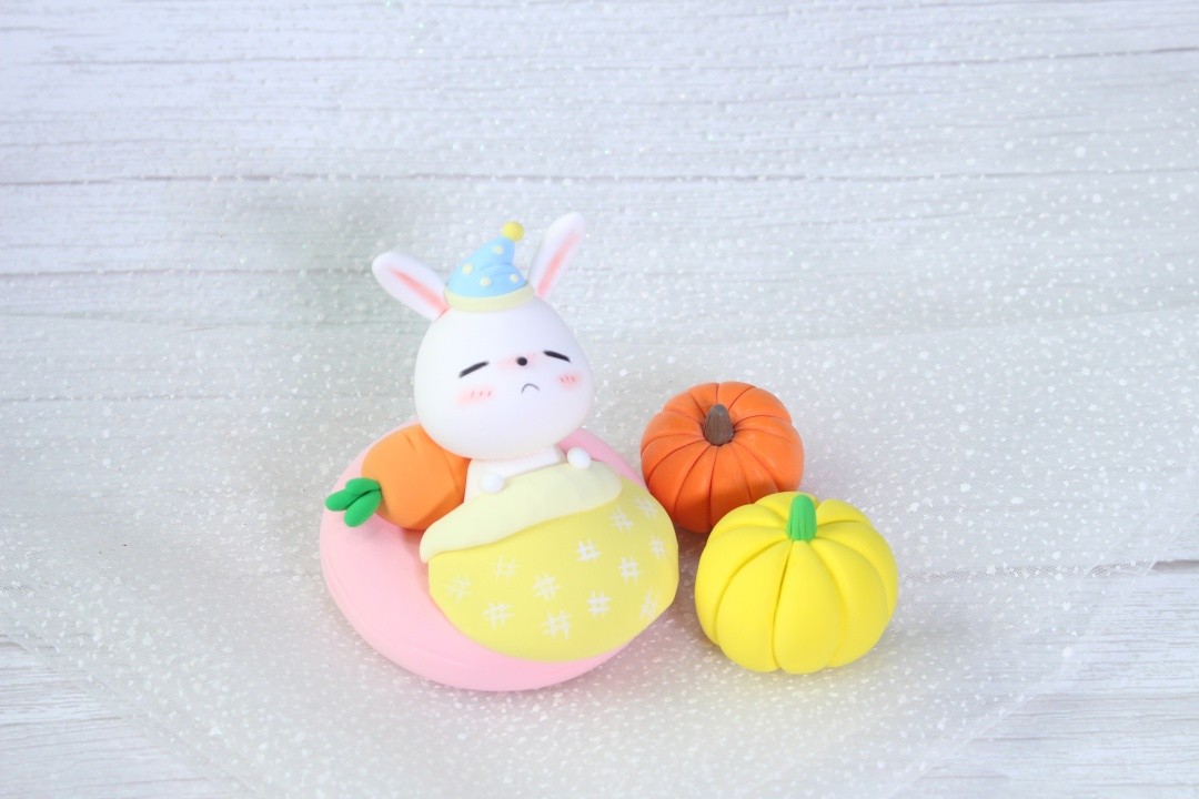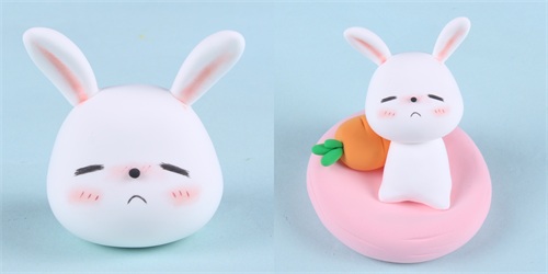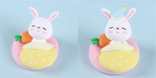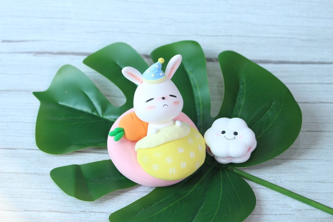 黄色粘土和淡黄色粘土做一床小被子盖在小兔子身上,最后做出小兔子的胳膊,然后做一顶黄色的小睡帽戴在小兔子头顶,这样可爱的小兔子就做好啦!