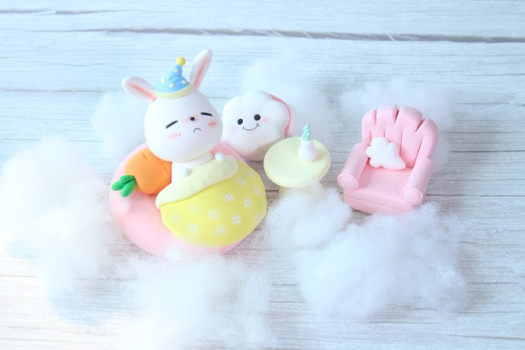 黑色粘土做出小鼻子,然后用黑色笔画出眼睛和嘴巴,用色粉涂一下耳窝和腮红,按照上图的样子做出小兔子的身体,和头部粘在一起,放在小床上做好造型。