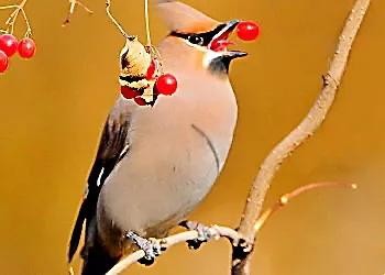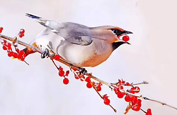 太平鸟的食性:繁殖期主要以昆虫为食。秋后则以油松、山楂、酸果蔓、蔷薇、忍冬、卫茅、鼠李等植物的果实、种子、嫩芽等植物性食物为食。