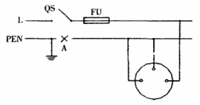 在三相四线制供电方式中,主要采用 TN-C 系统供电系统,对于单相回路存在较大的安全缺陷。单相二线供电方式,最大缺陷是在发生电器外壳碰相线时,直接将 220V 相电压施加给此时正巧触摸到的人,从而发生触电事故。但如果把接外壳的保护线 PE 和中性线 N 并联合用一根,实际上这也是极不安全的。建筑物的配电线路由于接头松脱、导线断线等故障,很可能造成图 2 所示 A 点处开路,此时当其中一台设备开关接通后,在 A 点后面所有中性线上,将出现相电压,这个高电压又被设备接地引至所有插入插座的用电设备外壳上,而且其后的设备即使并未开启,外壳上也有 220V 电压,这是十分危险的。