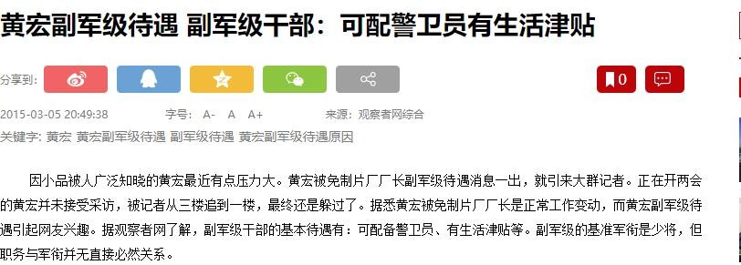 观察网综合 2015-3-5 黄宏副军级待遇 副军级干部:可配警卫员有生活津贴