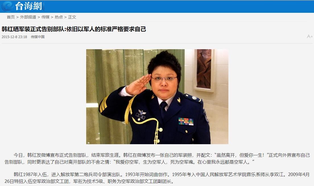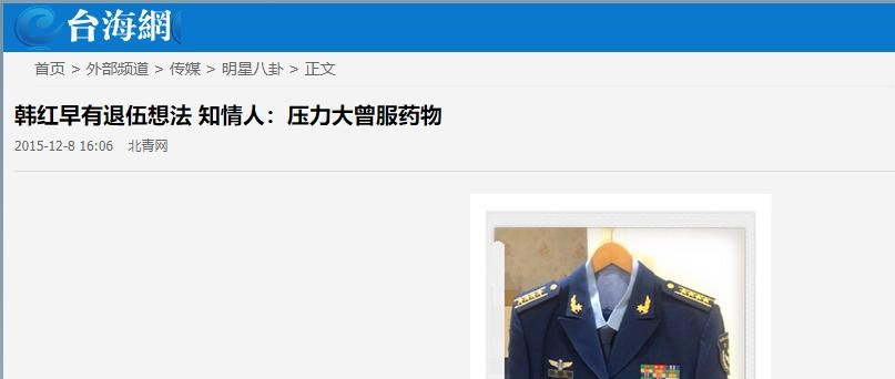 台海网 2015-12-8 韩红早有退伍想法 知情人:压力大曾服药物