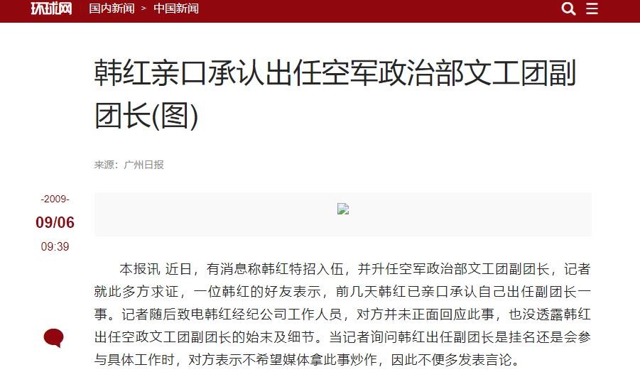 信源来自:环球网 2009-9-6 韩红亲口承认出任空军政治部文工团副团长(图)