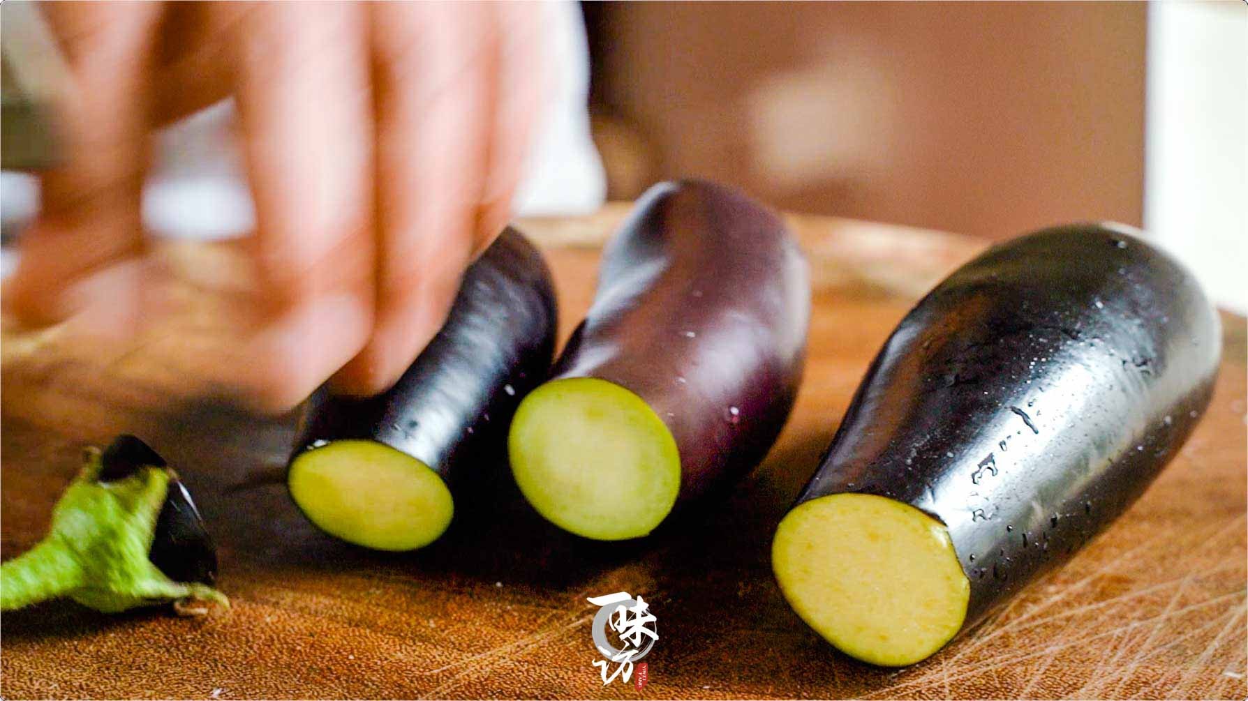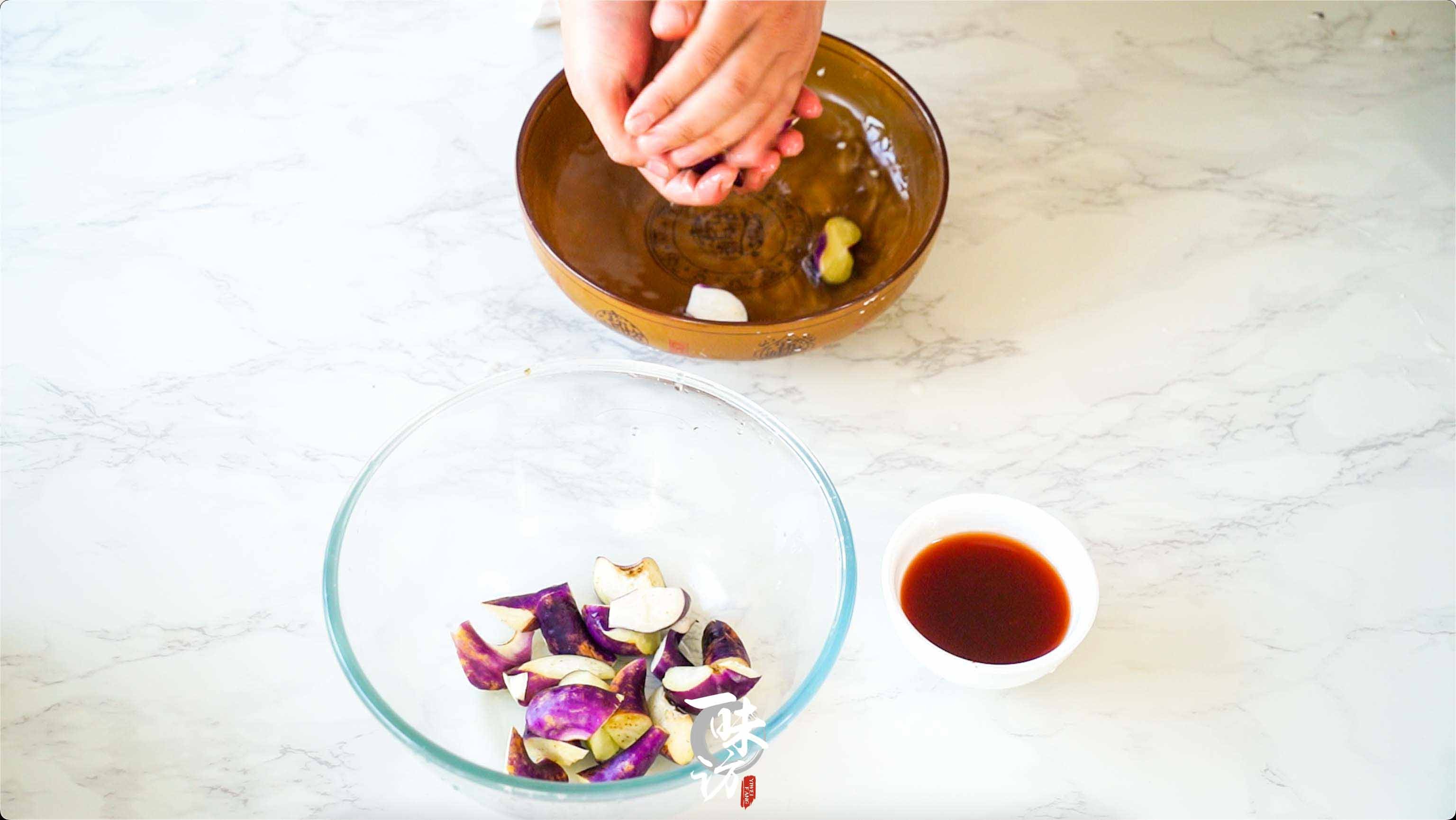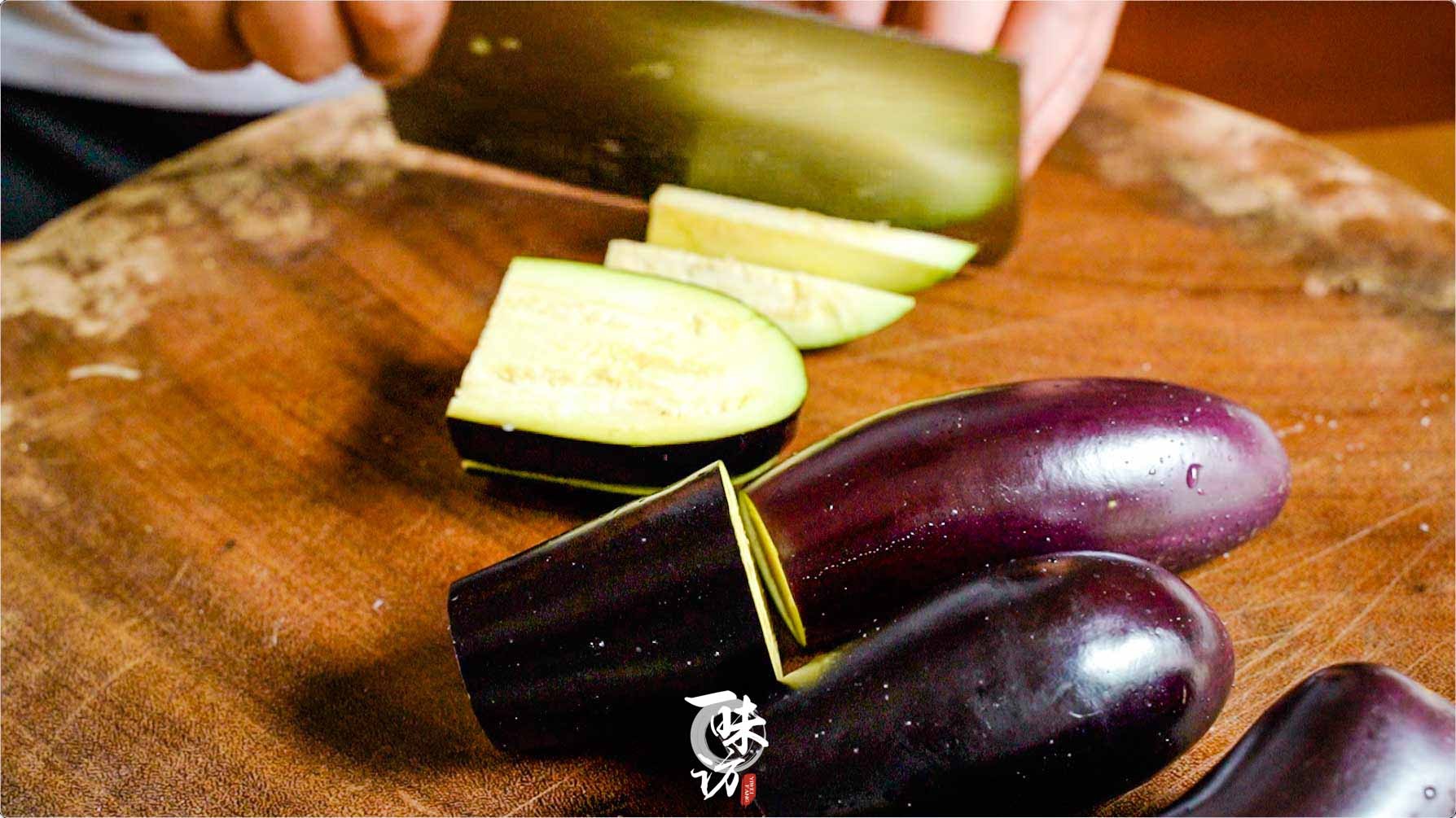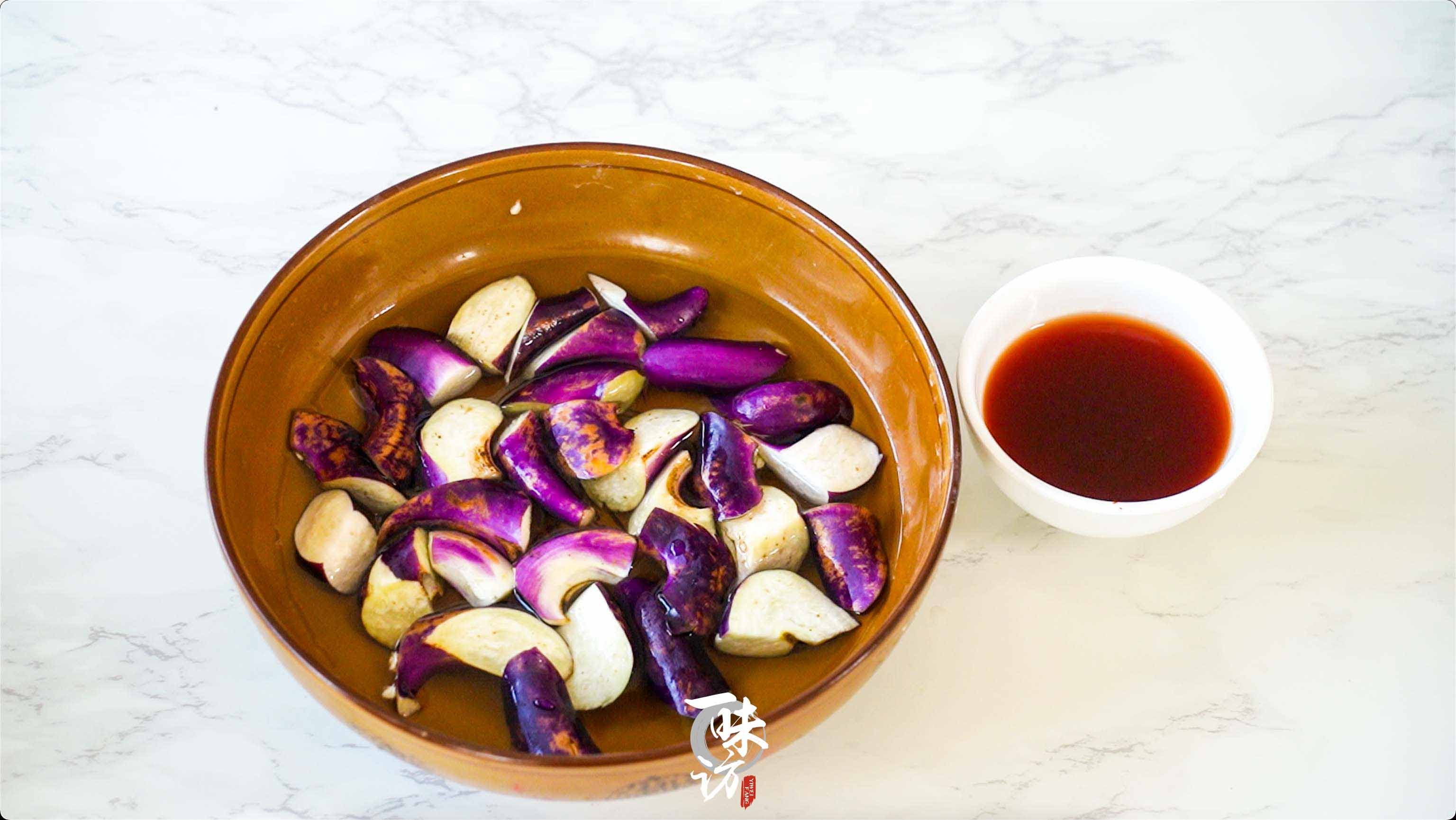 1 茄子的切制要保持滚刀块儿状,既不要太大,也不能太小,此外一定要经过盐水处理,并且捞出的时候要用劲儿挤干水分,这样才有助于这道菜的材料的新鲜,也便于后面的操作。