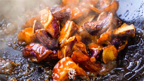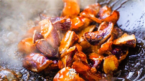 将茄子翻炒成熟,且耗干汤汁后即可出锅盛盘。