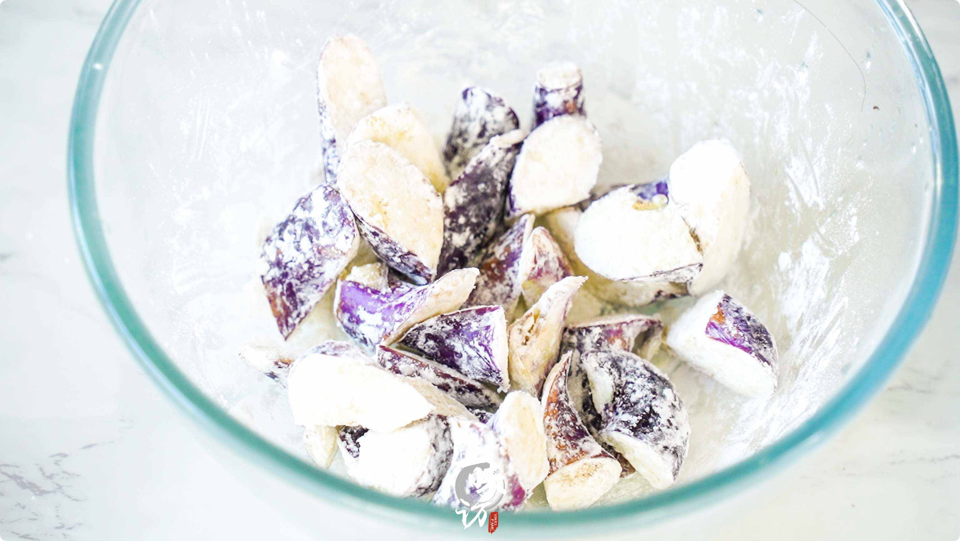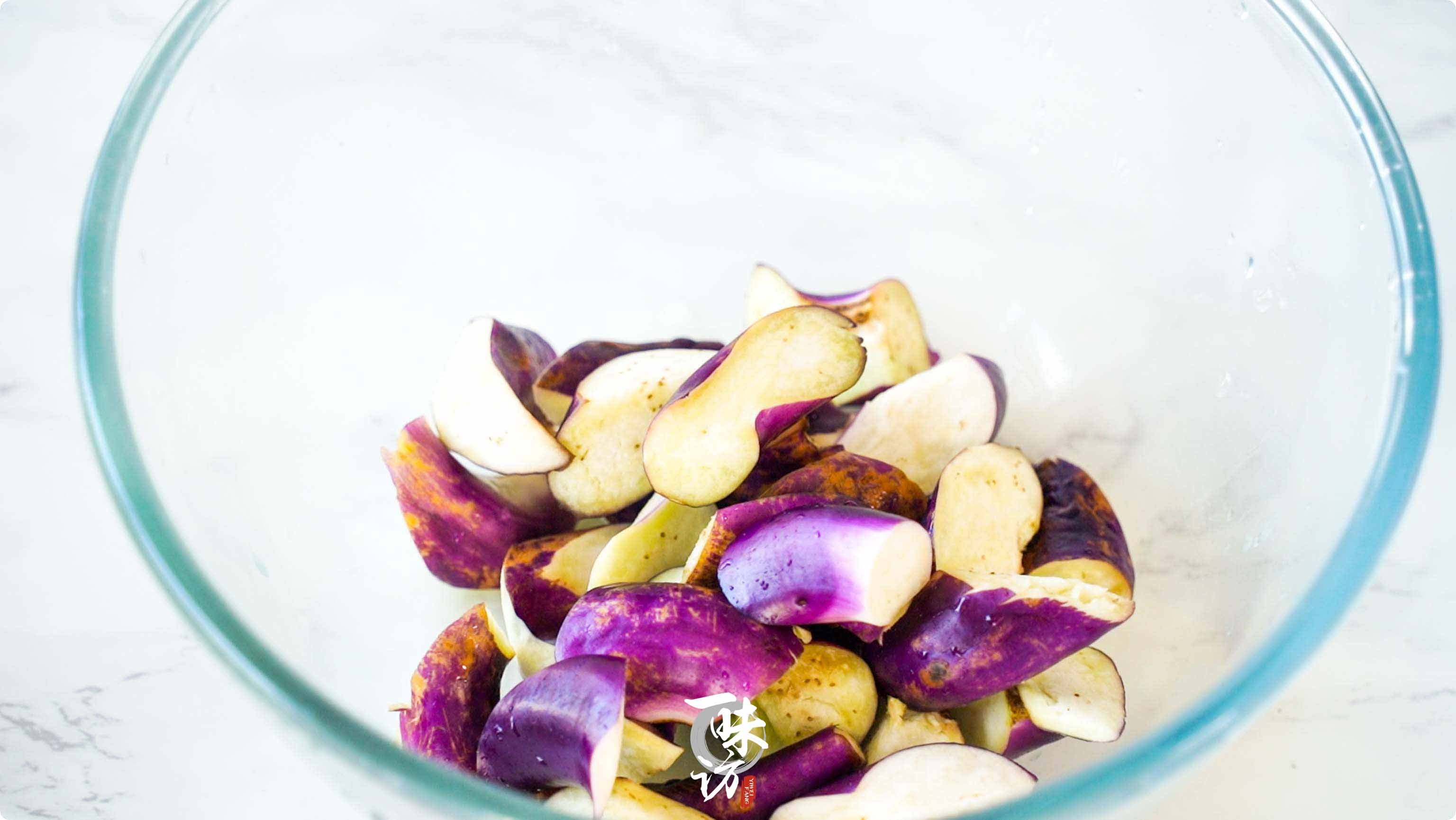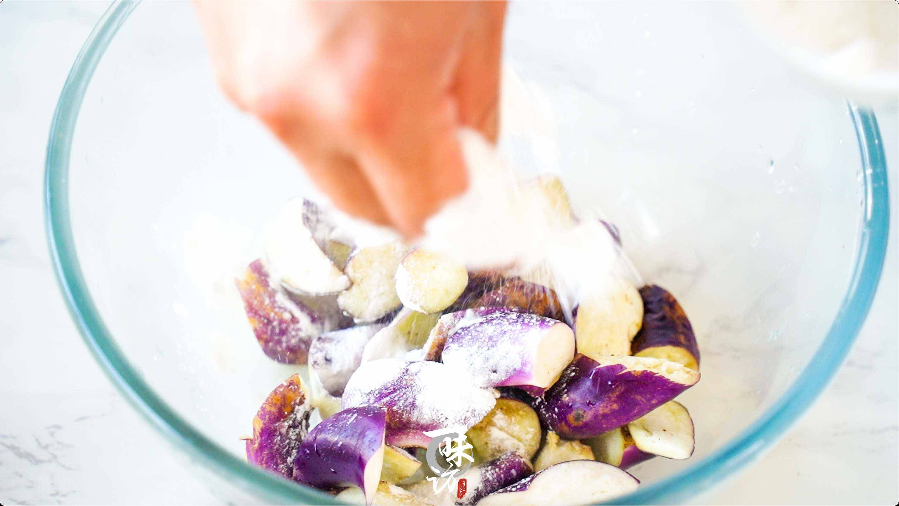 茄子不能单纯去炸制,得弄一些玉米淀粉,这样不仅有利于很快地炸制成熟,而且对于口感的综合性也有所帮助。