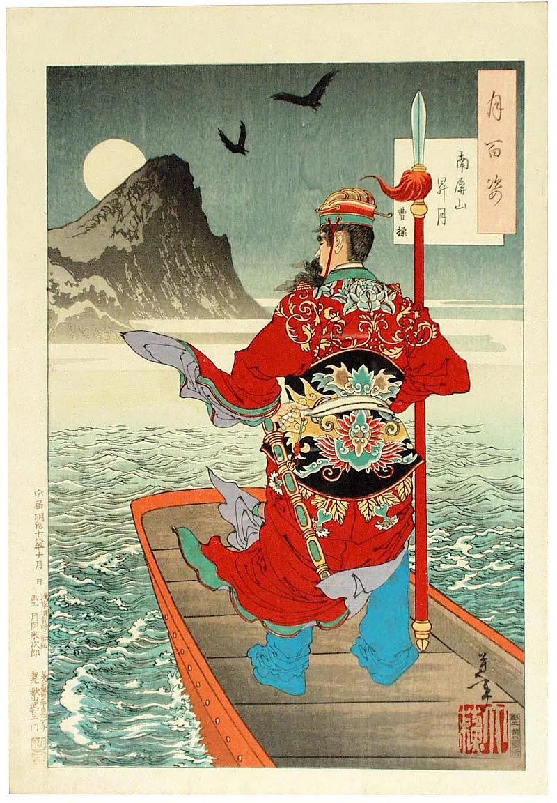 操父子的诗文都是当时一流的。图为 月冈芳年所绘 曹操横槊赋诗。
