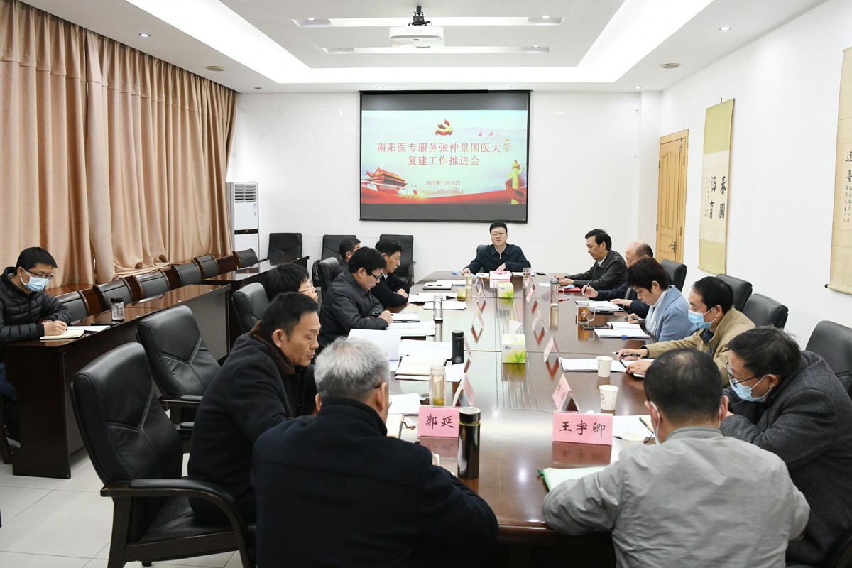 2021年11月15日,南阳医专召开服务张仲景国医大学复建工作推进会。工会主席田端介绍了学校服务张仲景国医大学复建工作的基本情况,指出了当前的工作进度和存在的问题不足。党委书记柳明伟在听取汇报后也作了相关讲话。