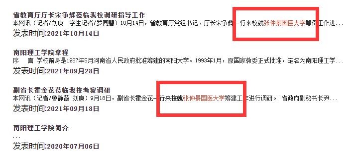 同时,从南阳理工学院官网搜索“张仲景国医大学”关键词,河南省相关领导和省教育厅领导也高度重视张仲景国医大学的复建工作。