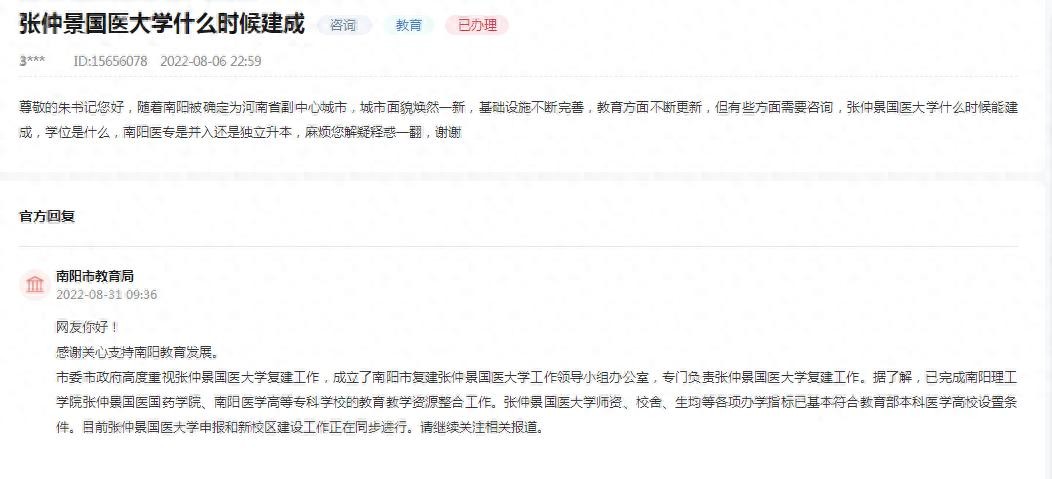 8月31日,南阳市教育局回复该网友,“网友你好! 感谢关心支持南阳教育发展。 市委市政府高度重视张仲景国医大学复建工作,成立了南阳市复建张仲景国医大学工作领导小组办公室,专门负责张仲景国医大学复建工作。据了解,已完成南阳理工学院张仲景国医国药学院、南阳医学高等专科学校的教育教学资源整合工作。张仲景国医大学师资、校舍、生均等各项办学指标已基本符合教育部本科医学高校设置条件。目前张仲景国医大学申报和新校区建设工作正在同步进行。请继续关注相关报道。”