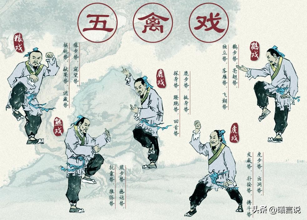 事实上,华佗不仅医术了得,他还是一个养生大家。他引用鹿、虎、熊、鸟等动物的动作,依据中医的阴阳五行、气血运行规律编创五禽戏,以达到养生健身,通经活络的目的。