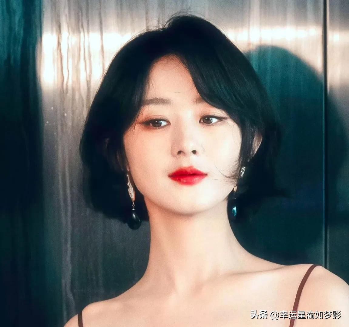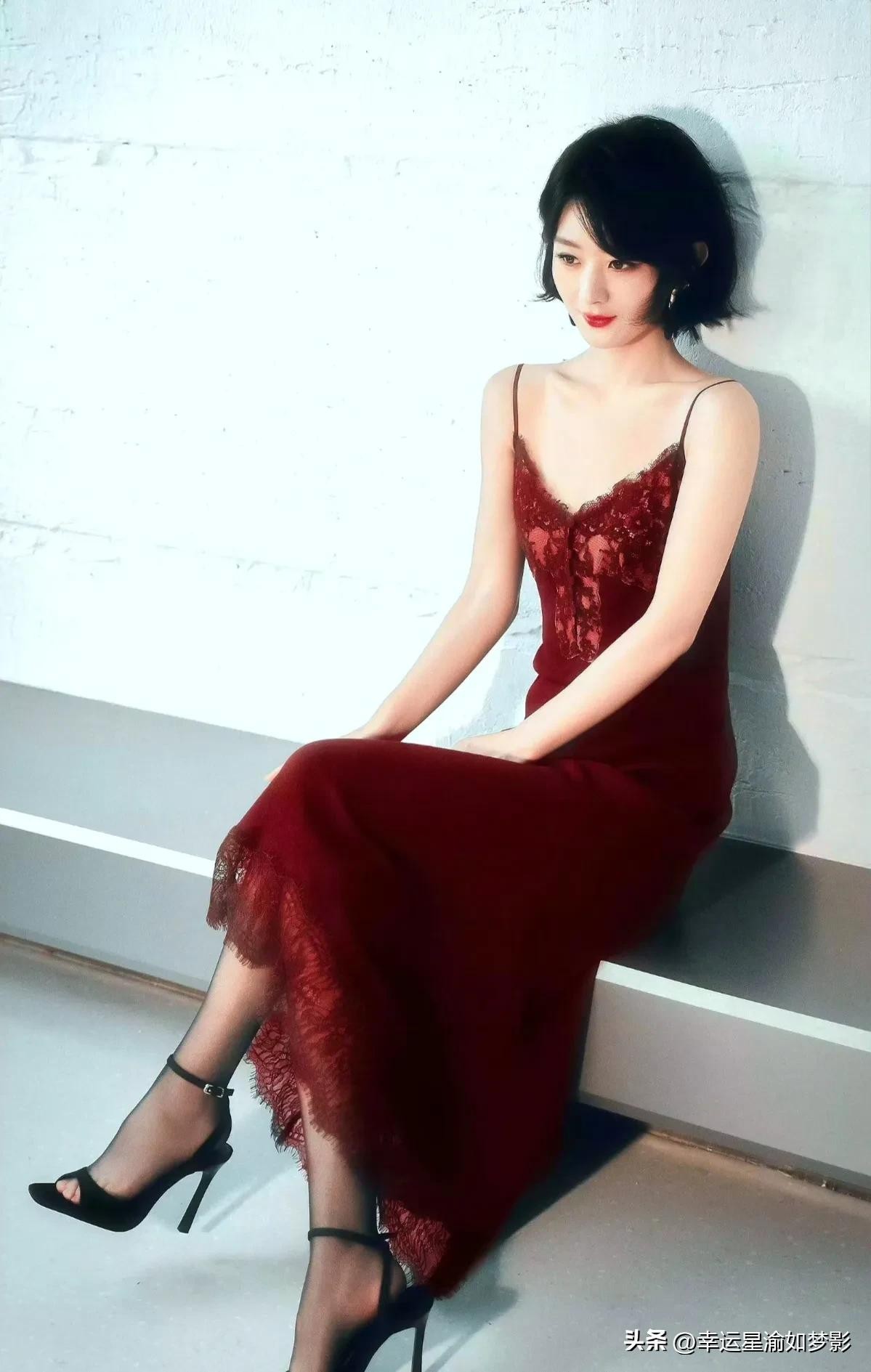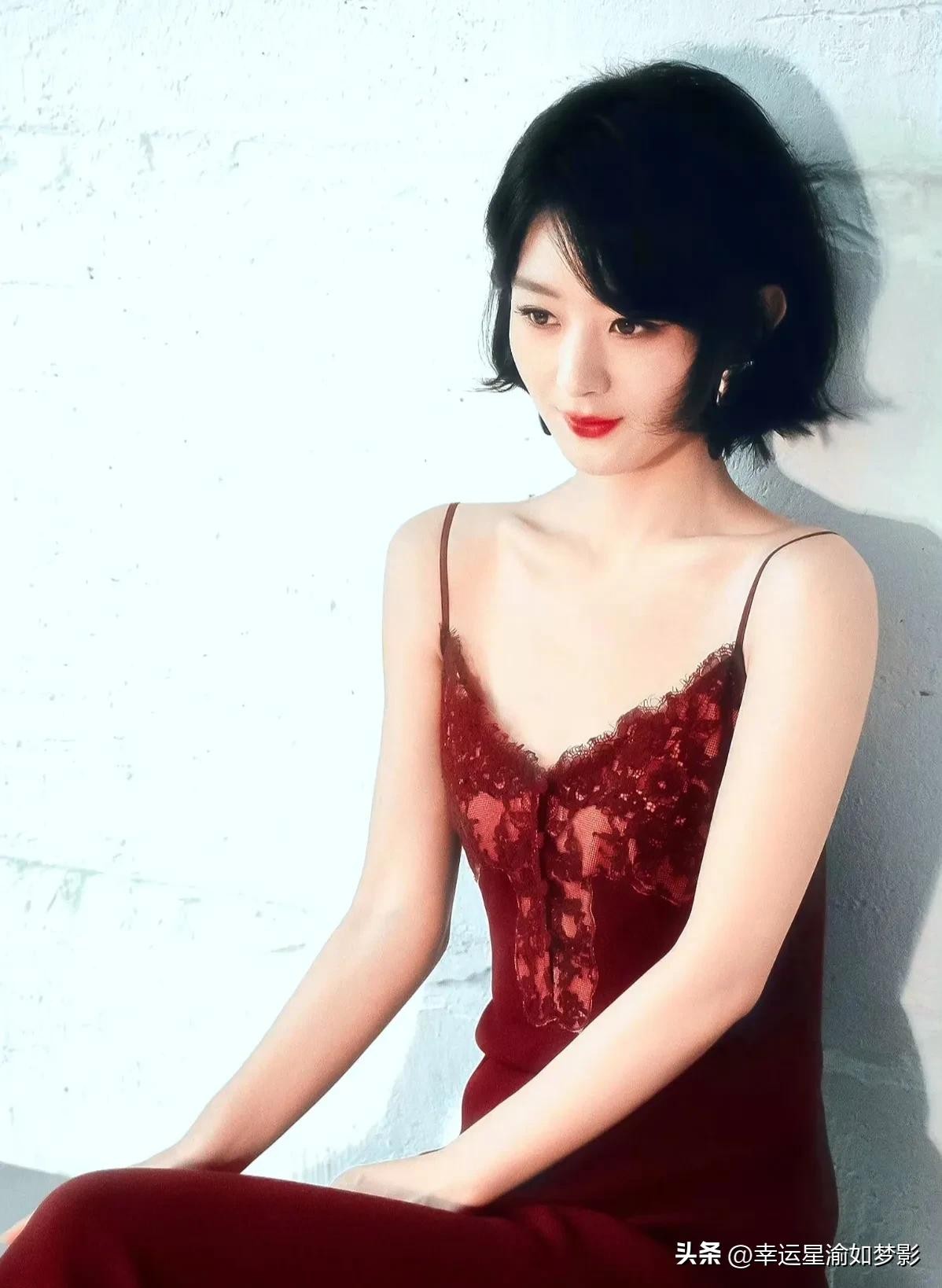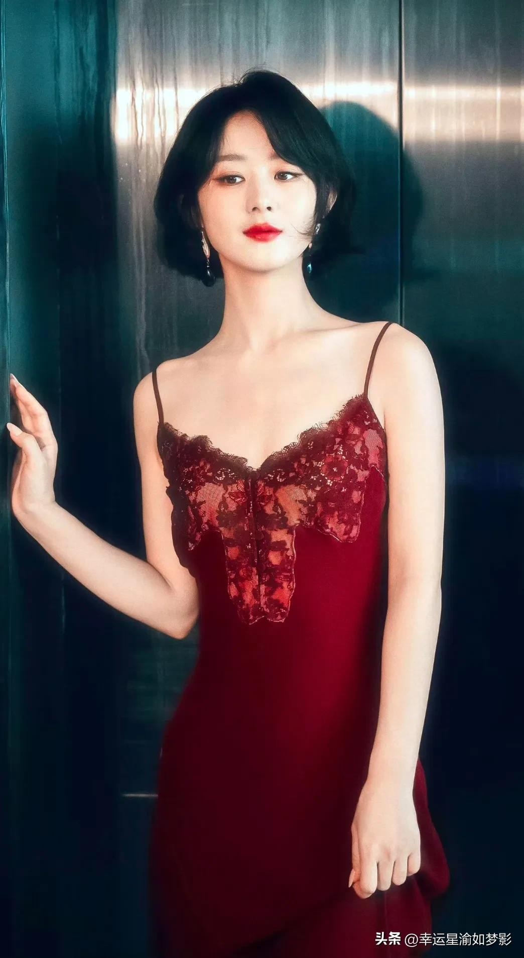 她复古红唇妆容突特别出精致五官,高跟 长裙和短发造型都端庄大气,赵丽颖诠释多种混搭风格也有慵懒中柔美啊!