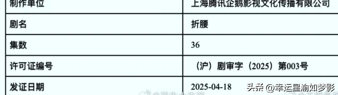 电视剧《折腰》18日取得发行许可证,由刘宇宁和宋祖儿“先婚后爱”设定古装剧,宣璐、刘端端、何泓姗、刘晓庆等参演共36集。