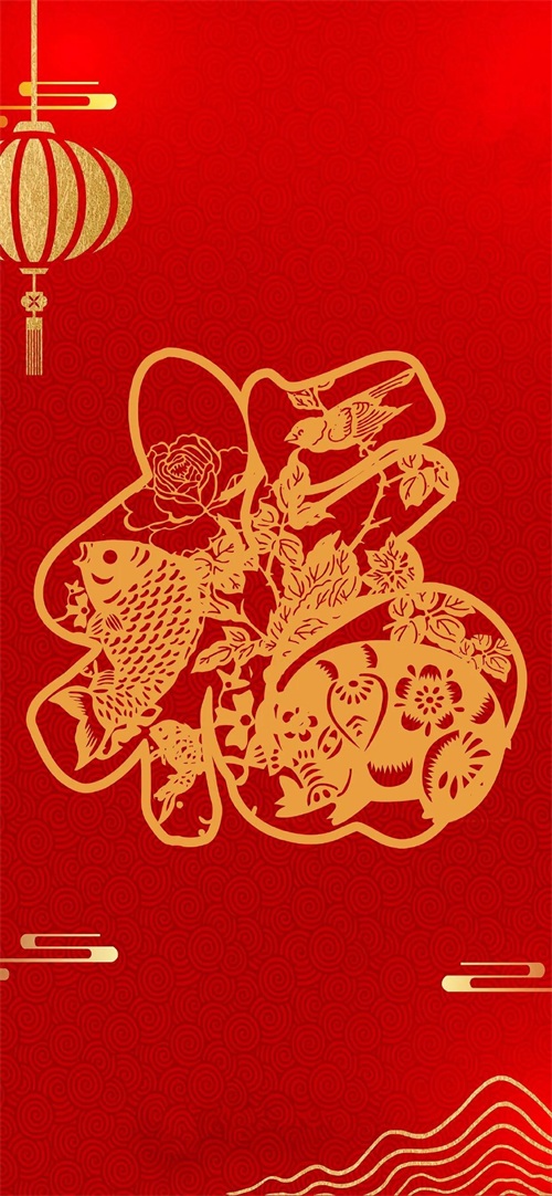 花纹非常多的剪纸福,包含了鱼、鸟,牡丹花、猪等花样:
