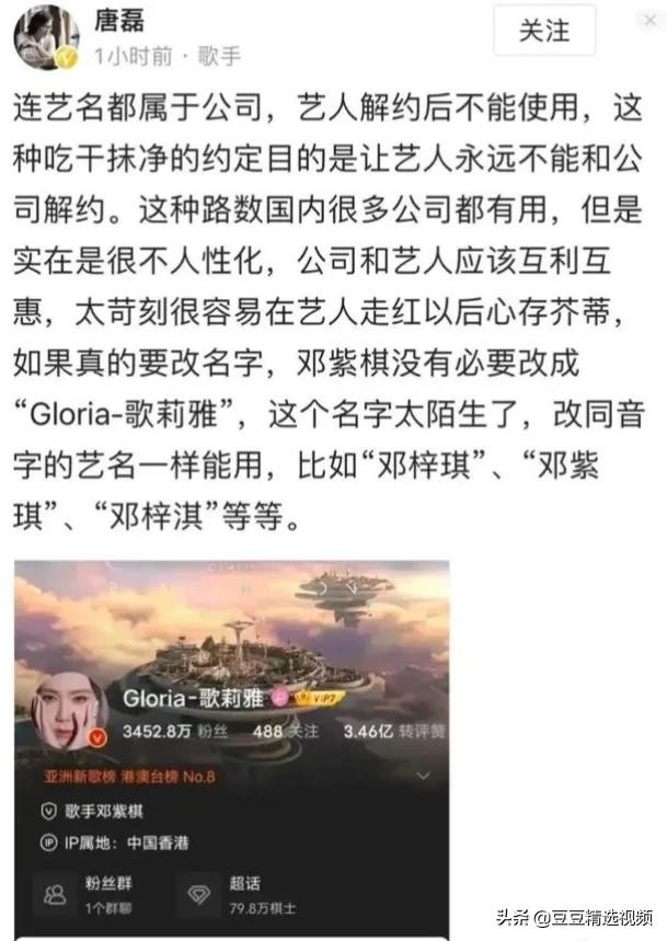 香港歌手邓紫棋近期强势回归,推出新专辑。 他还根据专辑的主题,将微博名称改为“Gloria Gloria”。 然而,这种做法却引来歌手唐磊发帖提议,将艺名改为谐音。 艺名比较好记,感觉格洛丽亚的“名字太陌生了”,她的言论也引起了网友的热议。