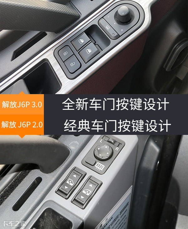 坐进车内,对于各大功能区我们从左至右逐一说起。首先是车门按键控制区,新款解放J6P采用金属拉丝面板,并搭配J7同款功能按键。相比之下,现款车型则是显得朴素了不少,不过两款车型在车门开启方式上,还是保持了一致。