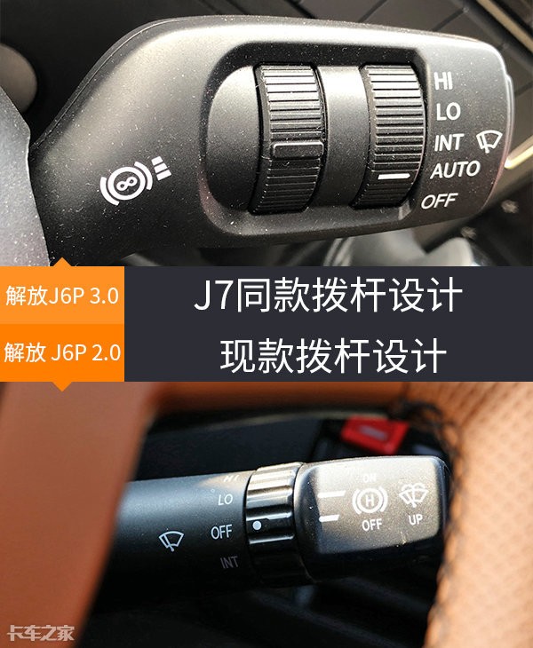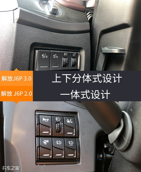 在方向盘左下、中控台最左侧的功能区位置,新款解放J6P采用了上下分开式设计,上为旋钮式灯光控制,下为按键式功能开关,整体采用了J7同款按键样式,现款车型则是采用一体式按键布局。