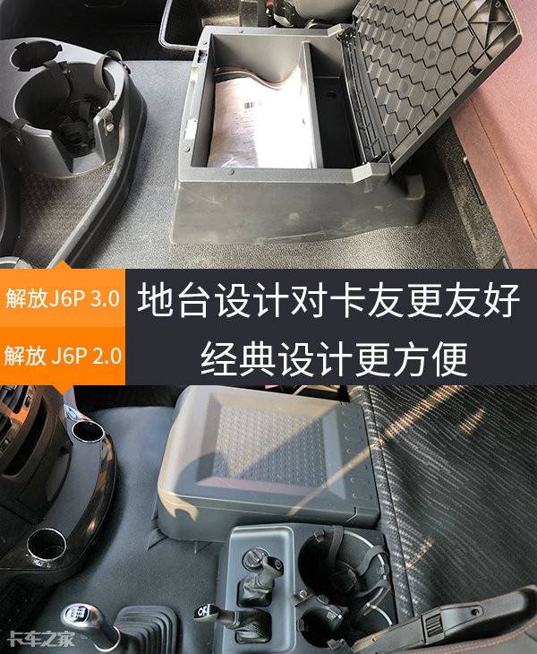 在中间地台位置,因新款解放J6P车型将挂车制动手柄和大容积的储物槽设计在中控台上(如图位置),使得驾驶员从驾驶位到卧铺的过程更为便利,这一点是比现款车型要好得多的。