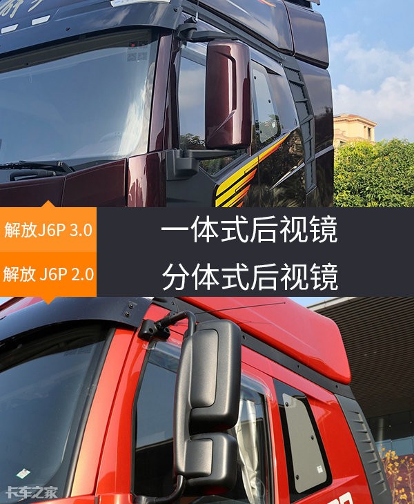 在后视镜位置,新款解放J6P采用了全新设计的一体式后视镜,与车身同款配色,在阳光下熠熠生辉。虽然同为领航版车型,现款车型依然是使用了分体式后视镜。