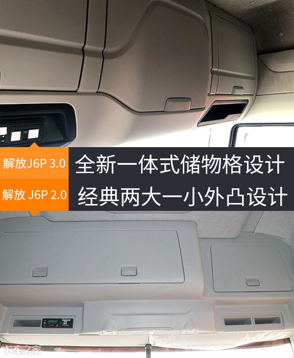 在头顶储物空间方面,新款解放J6P并没有沿用现款车型的两大一小储物格外凸设计,而是采用了整体较为舒缓的“一体式”样式,看上去很美观、设计感十足,同时储物能力也是得到了提升。