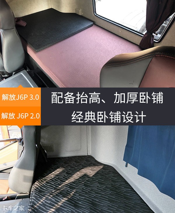 两款车型在卧铺位置的设计方面并没有太大的差别,无论是样式还是宽度都保持了一致。但是新款解放J6P的下卧铺被进行了加厚和抬高,整体舒适性得到了提升,此外空间也足够为卡友在闲暇之余得到良好的休息。