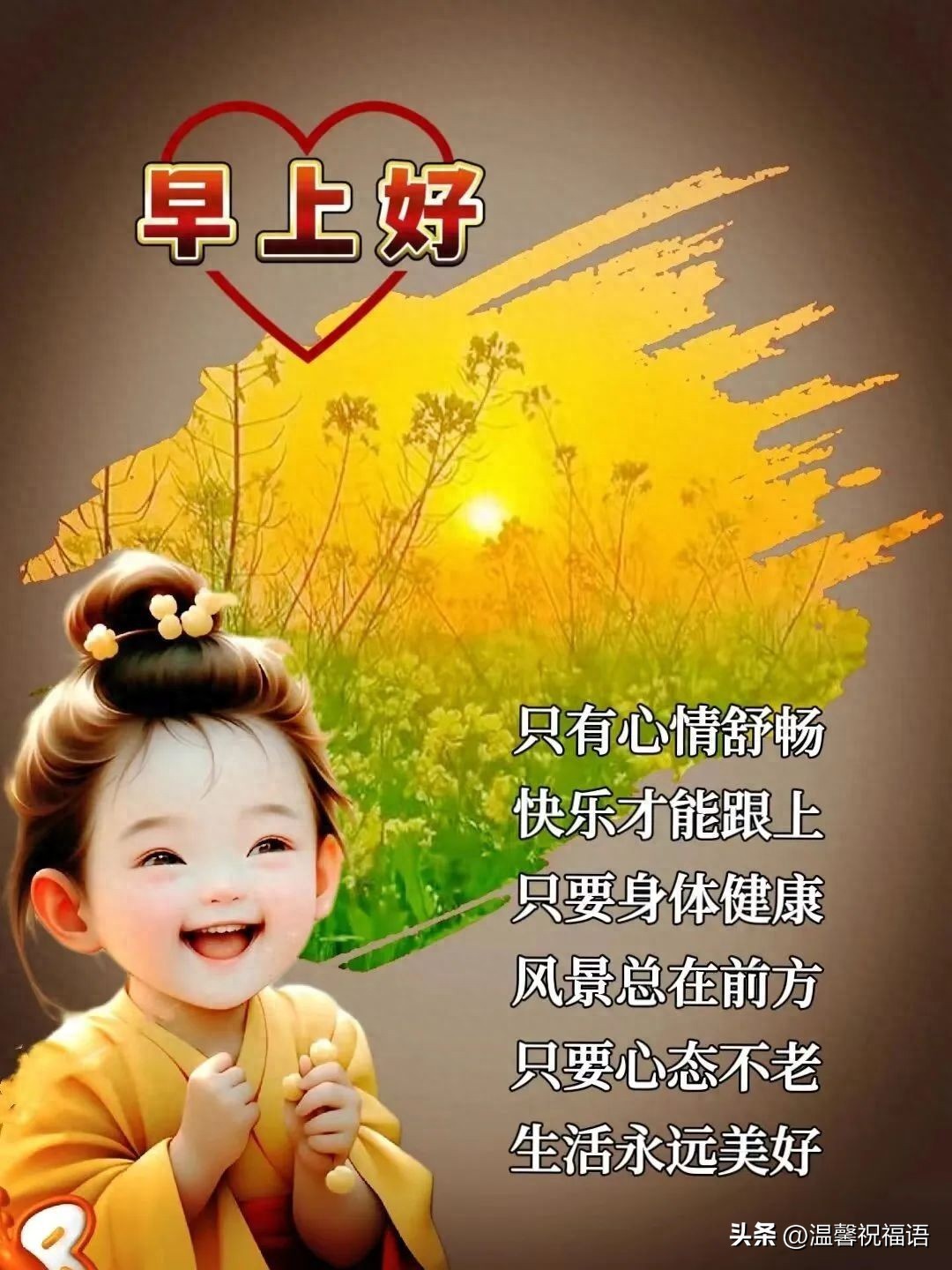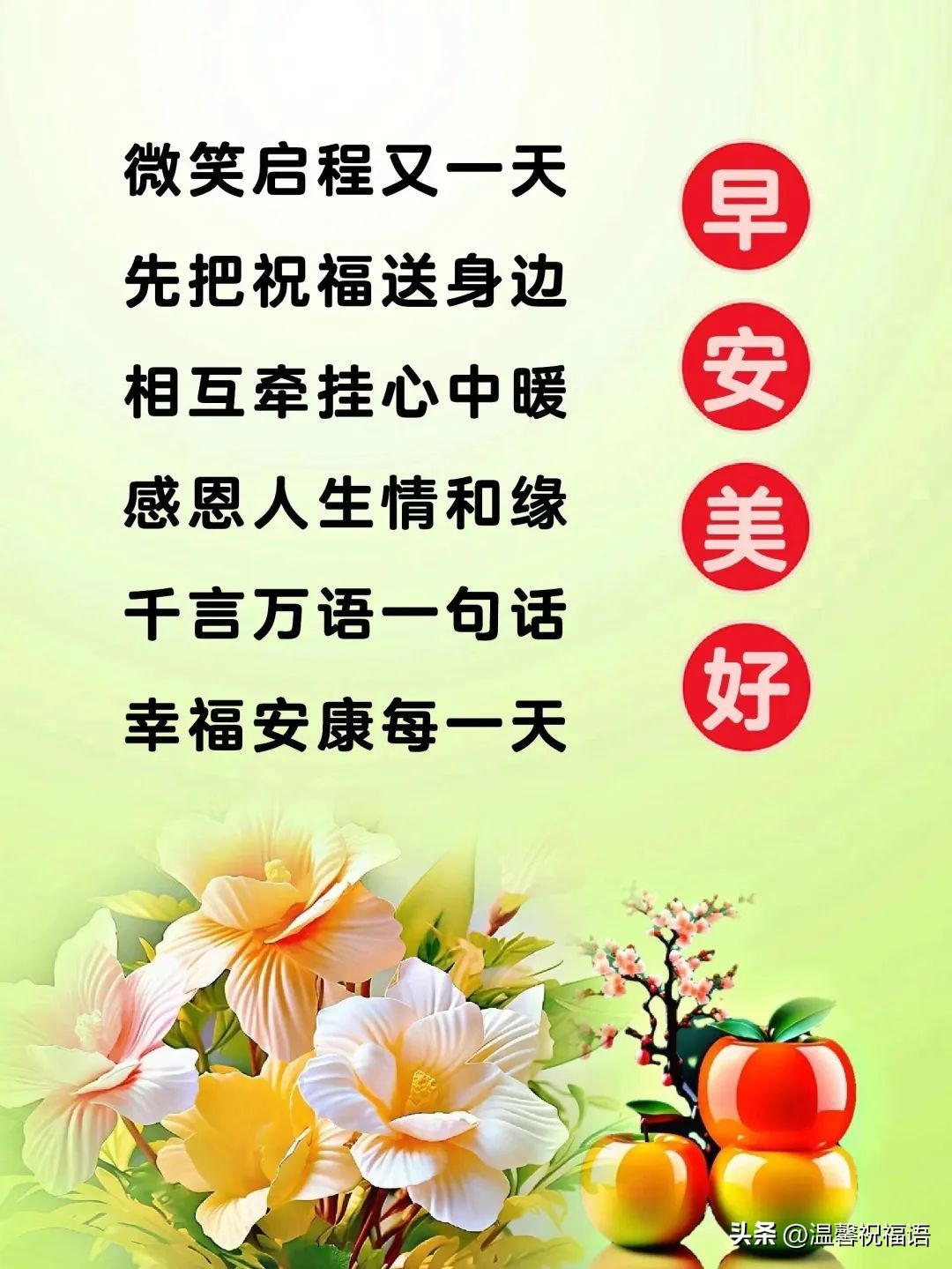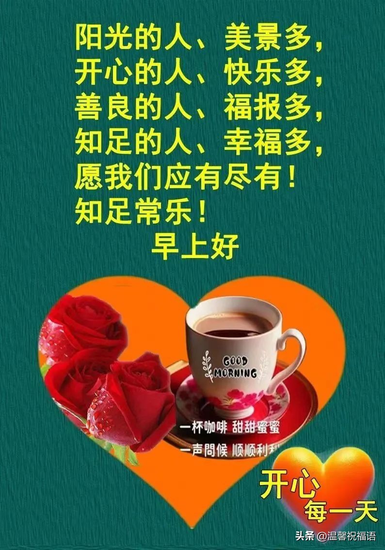 11、温馨早晨送问候,友谊长跑笑开口。风和日丽多美好,愿你笑口常开笑。朋友早安全世界,美梦勾勒盛开花。细雨点滴柔如丝,晨光沐浴情更深。友情真挚如初恋,温暖心房又温馨。早上好朋友快乐,吉祥幸福伴身旁。