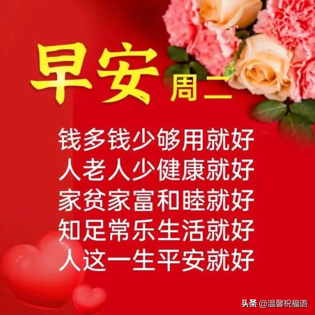 10、人的一生中,用平常心来生活,用真诚心来待人,用宽容心来处事,用执着心来追梦。所有期待的一定会在预料之中越来越好。祝朋友顺心开心喜心乐心每一天。早安,愿你有个美好一天!早安周二!