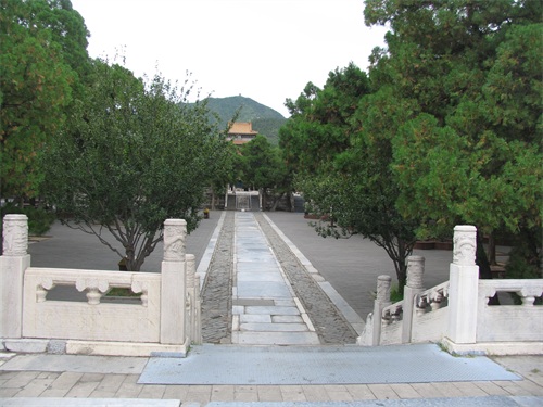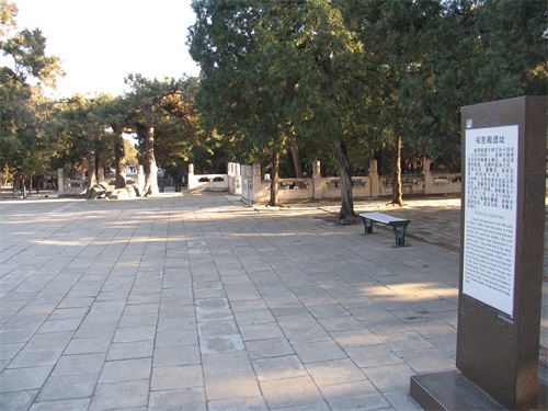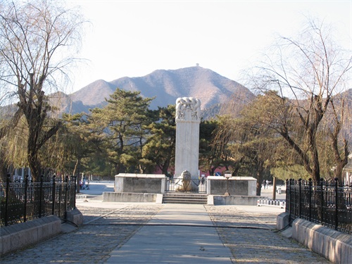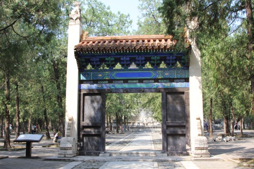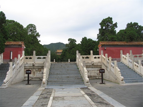 继续向北走,是定陵的陵门入口,陵门为单檐歇山顶式,制如外罗城门,黄瓦、朱扉、设券门三道,其左右各设有随墙式掖门一道。进大门后我们首先看见的是祾恩门遗址,位于祾恩殿前。定陵的祾恩门和祾恩殿在清兵入关时遭到严重破坏,现仅存两处台基,分别为祾恩门和祾恩殿遗址。祾恩门遗址面阔五间,进深二间,下承一层须弥座式台基。台基之上龙凤望柱头式的石栏杆,前后还各设有三出踏跺式台阶。