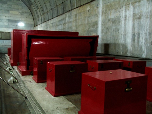 如今,摆放在玄宫后室的三口巨大的棺椁并不是原物,而是复制品。原来万历皇帝及两位皇后棺椁早在1959年9月30日就被定陵辖区的工作人员作为废物弃于附近的山谷之中。1966年8月24日,保存在定陵博物馆的万历皇帝和两位皇后三具尸骨被“红卫兵”摆到定陵门前广场上当作“牛鬼蛇神”进行批斗,然后焚烧。