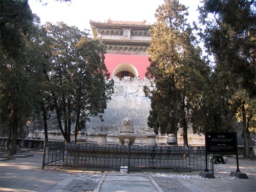 宝城在明楼的后面,是一道用城砖垒起的圆形大墙,墙上有垛口,城墙高7.5米,上厚下薄,周长800米,在它围绕的中间有一个人工堆成的大土丘,其实就是皇陵的坟头,叫做宝顶。宝顶下是地宫。宝城掩映在苍翠的山峦松柏之中。定陵宝城内有对鹿角柏是不能错过的,鹿角柏,又称帝王柏,据说树龄远远超过定陵的修建年代,显然这对柏树是当年修建定陵时从别处移栽过来的。两株造型奇美的鹿角柏,雄踞南北,充分显示了古代帝王九五至尊的显赫地位。沿着指示牌指引的方向,就来到定陵地下宫殿。