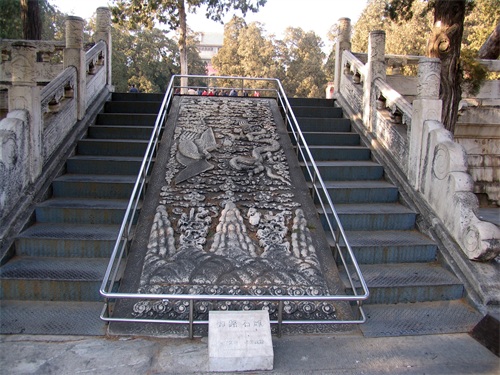 从祾恩殿遗址的台基下来,穿过沿中轴线的一座棂星门,移步前行便来到了石五供。石五供为象征性祭器,有香炉(一座)、烛台(二座)、花瓶(二座)置于石祭案之上,具有烘托陵寝纪念气氛的作用。抬头望去,在石五供后面便是明楼。从方城城墙拾阶而上,就来到明楼。