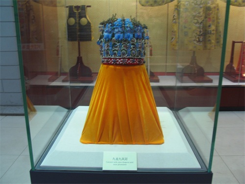 孝靖皇后的凤冠:九龙九凤冠,出土于定陵,高27厘米、口径23.7厘米、重2320克,有珍珠3500余颗,各色宝石150余块。此冠用漆竹扎成帽胎,面料以丝帛制成,前部饰有9条金龙,口衔珠滴下,有8只点翠金凤、后部也有一金凤,共9龙9凤。后侧下部左右各饰点翠地嵌金龙珠滴三博鬓。古代皇帝后妃的冠饰,其上饰有凤凰样的珠宝。明朝凤冠是皇后受册、谒庙、朝会时戴用的礼冠,其形制承宋之制而又加以发展和完善,因之更显雍容华贵之美。定陵出土的凤冠共有四顶,分别是“十二龙九凤冠”、“九龙九凤冠”、“六龙三凤冠”和“三龙二凤冠”。它们造型奇巧,制作精美,并饰有大量的珍珠宝石。