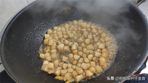 4 锅中少许的油,倒入扇贝柱翻炒,炒的过程中会出水,将水炒干