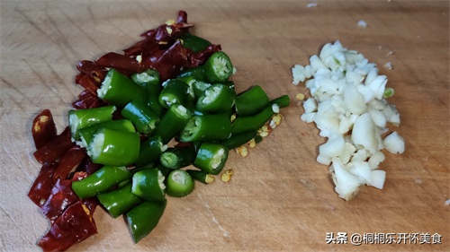 3 再来切点辅料,青红辣椒切段备用,蒜切成蒜末备用