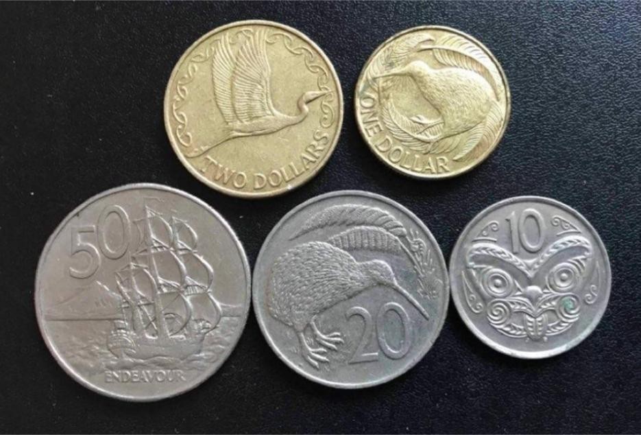 20分硬币上的图案也是毛利图腾木雕“普卡基”,还有一枚是新西兰特有的鸟类——几维鸟, 50分硬币上的图案则是英国航海家詹姆斯·库克船长的“奋进号”三桅帆船,背景是南岛库克峰,