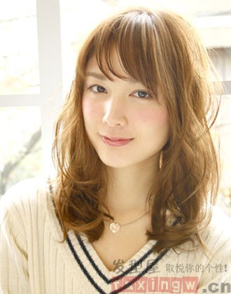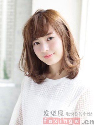 圆脸女生值得一试的一款蓬松中长发发型,棕色系的发色,搭配薄刘海的设计,修颜时尚两不误。
