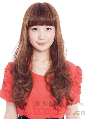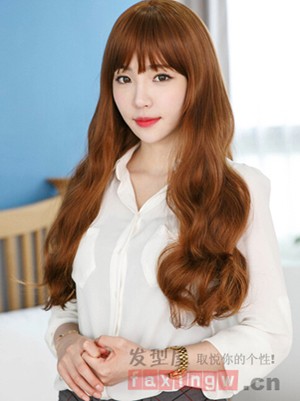 今年适合染什么发色?时尚盛行的今天,妹纸一头金棕色系的长发卷发发型,设计成齐刘海披肩卷发的造型,搭配白色的上衣,时尚又能提亮肤色,今夏不容错过。