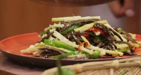 2、将野山笋去皮,洗净,切成丝,放入锅中煮熟;