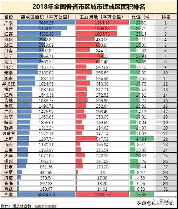 我们可以发现,建成区排名靠前的基本上都是人口大省和经济大省且地域广阔。而靠后的省份除了两个直辖市外经济都相对薄弱且人口、区域面积相对较少。