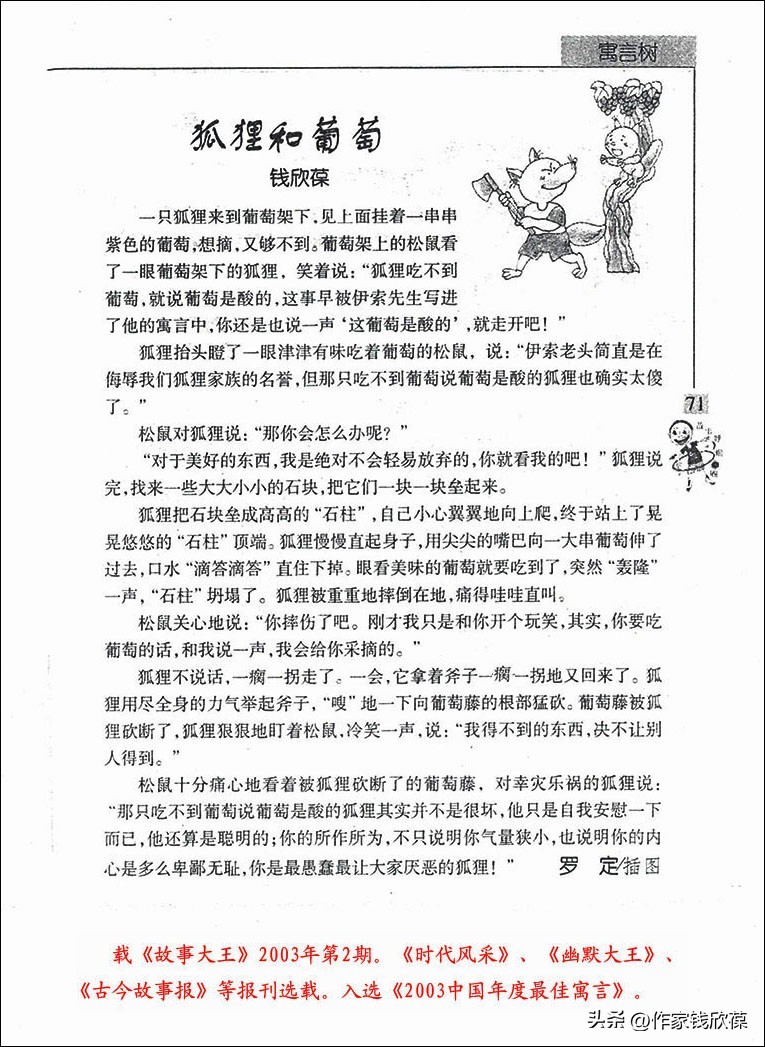 狐狸抬头瞪了一眼津津有味吃着葡萄的松鼠,说:“伊索老头写的《狐狸和葡萄》的寓言我早就看过了,这固然有损我们狐狸家族的名誉,但那只吃不到葡萄说葡萄是酸的狐狸确实太傻了。”