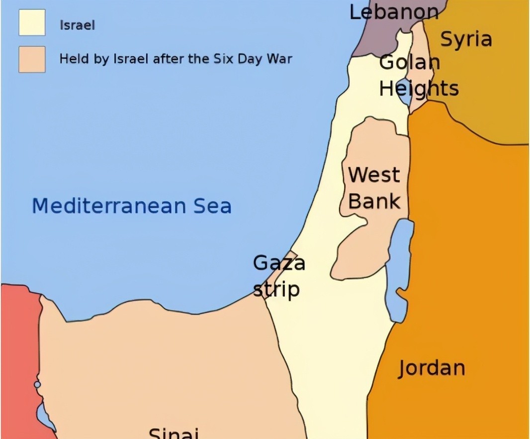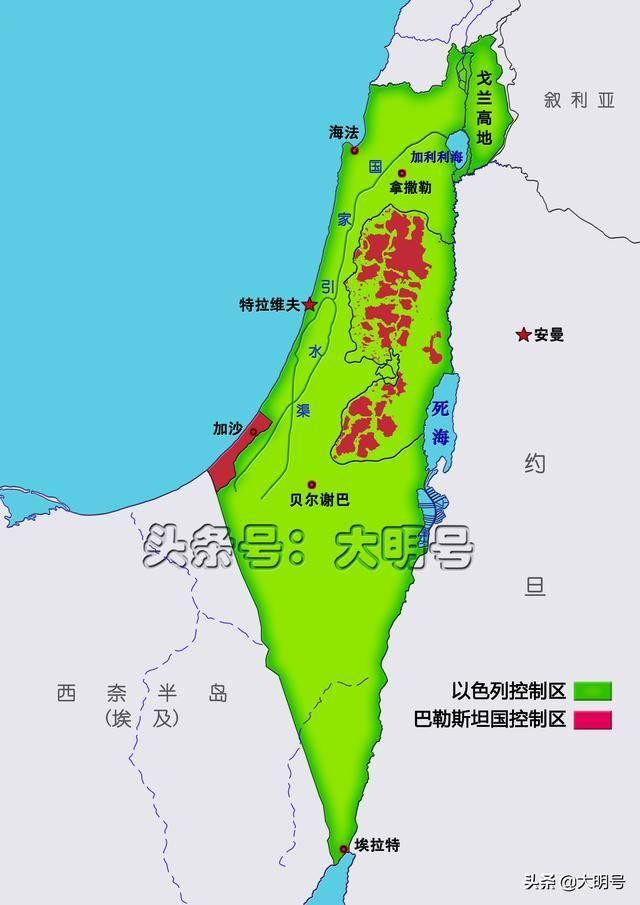 二、以色列建国的第二天,阿拉伯国家就大举向新建国的以色列发动进攻,史称第一次中东战争,以色列取得了胜利,一直到六日战争,以色列实际控制区略有增长,变化不是十分大,1976年第三次中东战争后,由于以色列在6天内打败了埃及、叙利亚和约旦,取得了绝对的优势,以色列借机占领了约旦河西岸和加沙地带,同时占领了埃及西奈半岛和加沙地带以及叙利亚和戈兰高地,接着,又从约旦夺走了东耶路撒冷,并宣布整个耶路撒冷为以色列的首都(上图中肉色部分,图中右下角为埃及领土西奈半岛,右上角为叙利亚领土戈兰高地,右边为约旦河西岸,左为加沙地带)