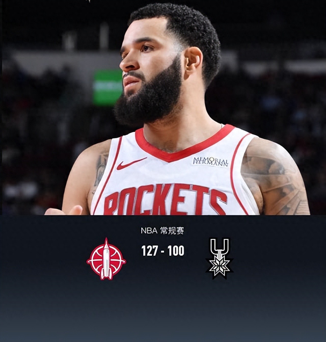 火箭127-100大胜马刺,范弗利特21+7+10,文班亚马15+6