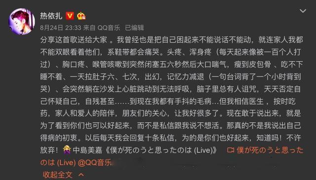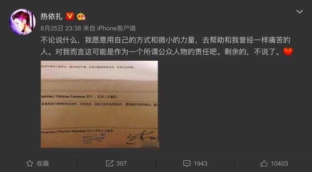 早前,热依扎曾屡屡在个人微博以及媒体面前曝出自己患有重度抑郁症和焦虑症。而且经常会出现幻觉,更甚至是自杀了好多次。她在网上晒出了自己的诊断证书,并称希望可以帮助更多的抑郁症患者。