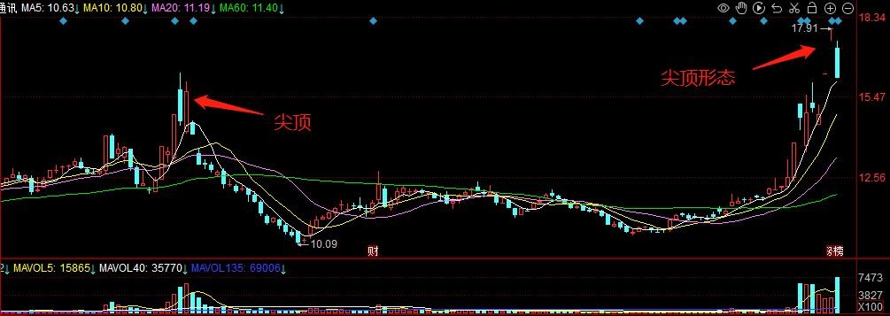 3. 从成交量上看,尖顶的出现往往伴随着天量,在转势点的成交量特别大。