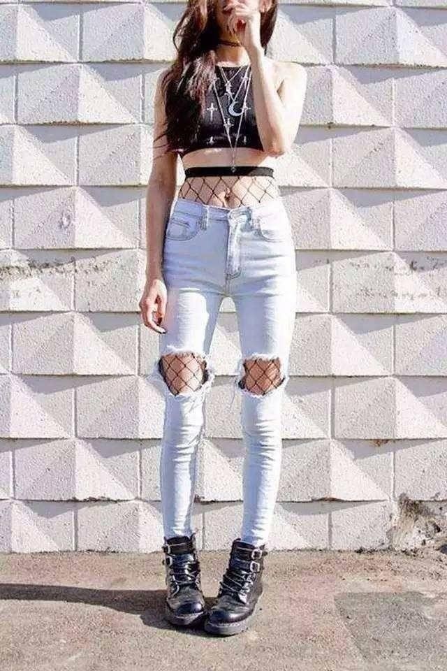 不难发现,刘亦菲和范冰冰穿的都是长款渔网袜,搭配不好觉得会低级趣味。怎样穿才会大气时尚呢,配破洞牛仔裤就是不错的选择啦。